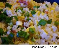 In a large skillet cook the bacon over medium heat. Once the bacon has browned, drain half the oil and push the bacon to one side of the skillet. On the other half of the skillet, add the 3 eggs and scramble until cooked. Turn the heat down to low. Add the rice until all ingredients are mixed. Add the soy sauce evenly over the rice and mix until the rice takes on a light brown color. Add the chopped green onion. Salt and pepper to taste.