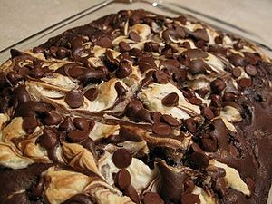 Drop by spoonfuls over the chocolate cake batter, leaving at least a one-inch margin around the sides of the pan (this helps prevent the cheesecake from bubbling over).